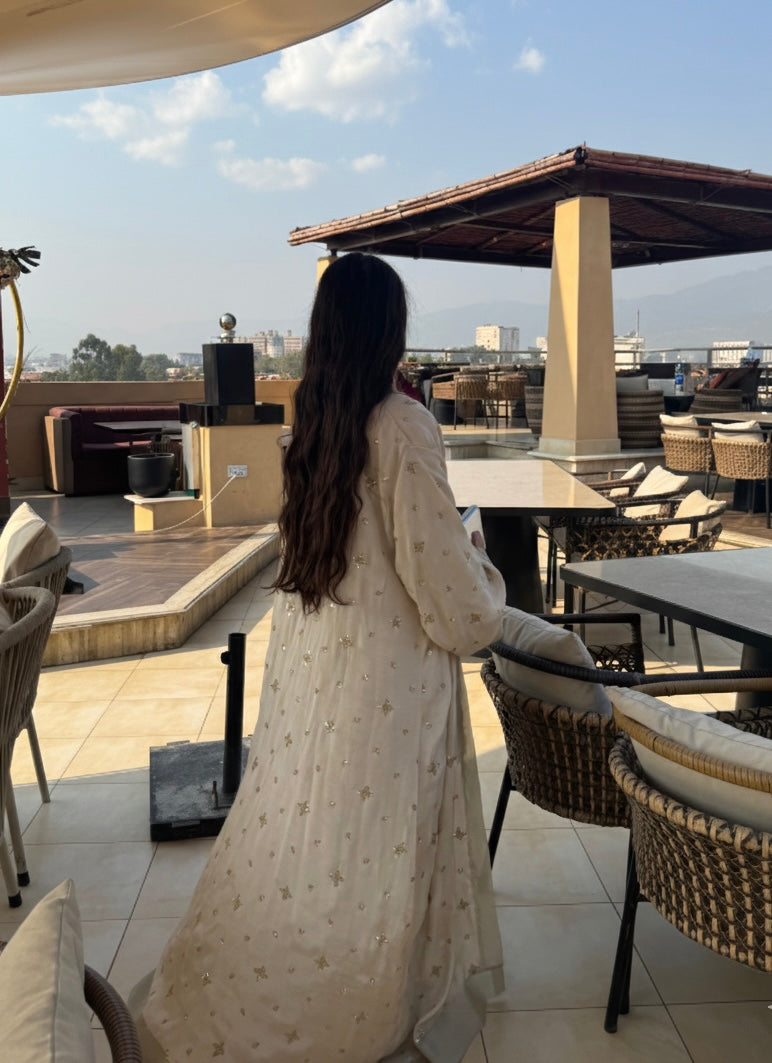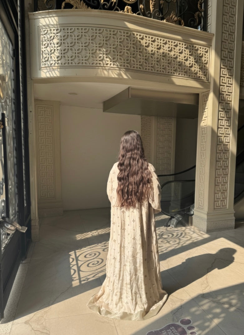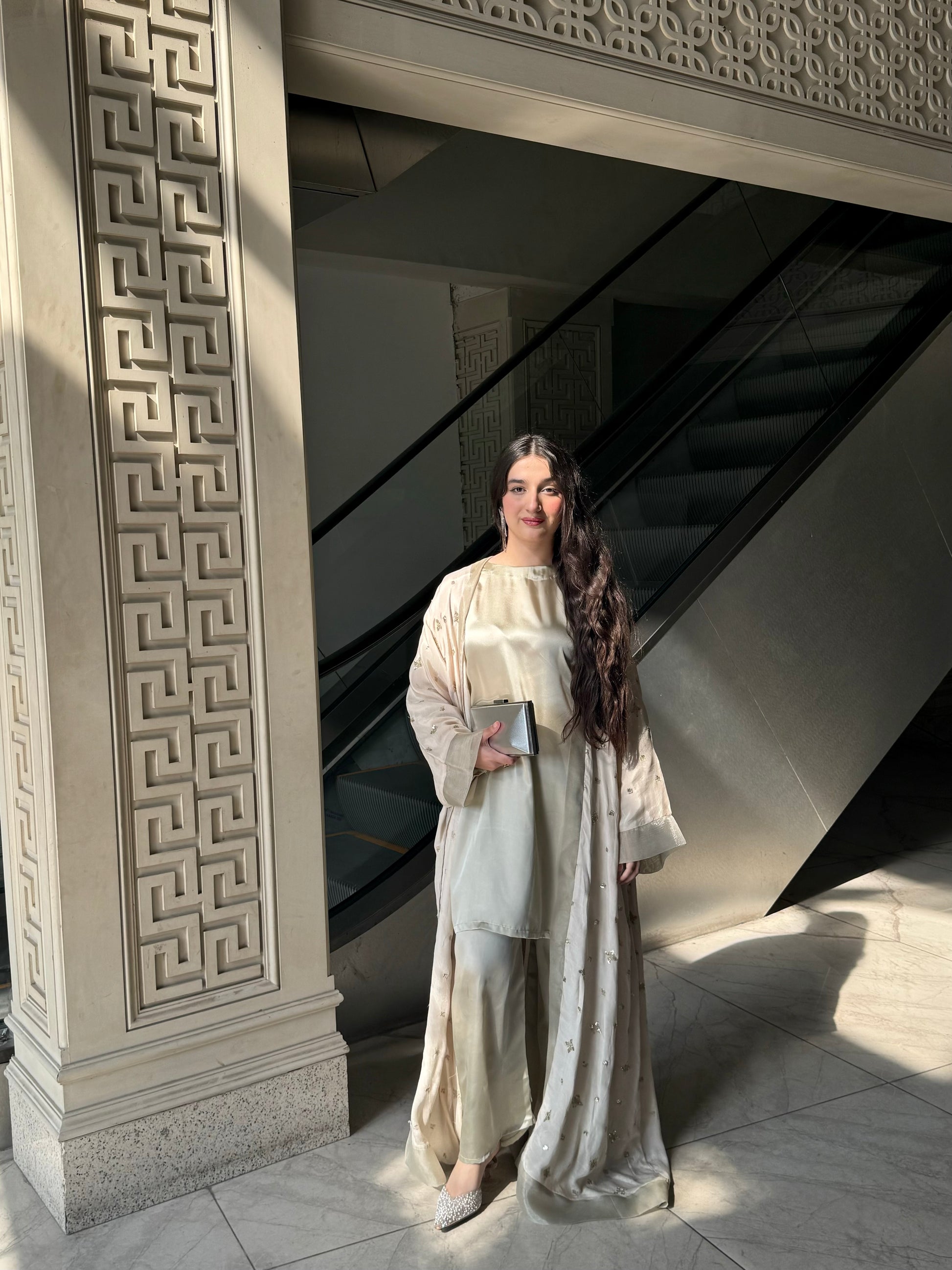 Ivory Muse Set is a graceful two piece outfit featuring a soft silk inner shirt with matching trousers, paired with an embroidered tissue silk abaya. The lightweight fabric and elegant detailing make it perfect for Ramadan and Eid wear, offering a timeless and refined look.